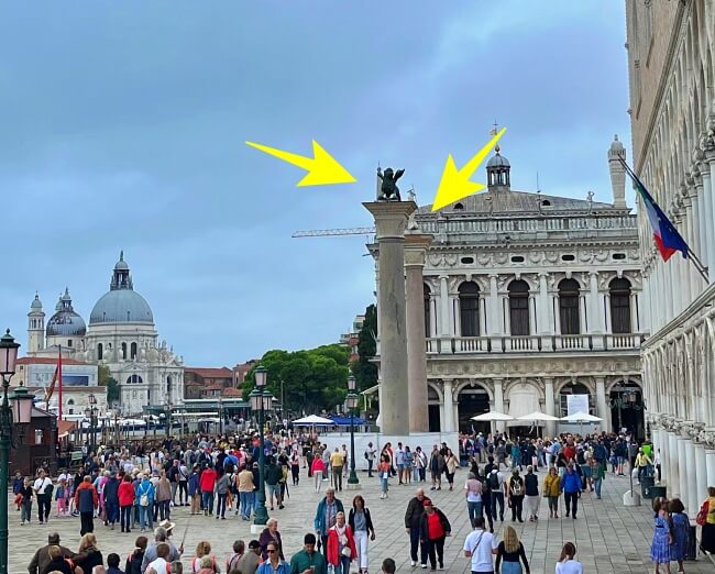 The two granite columns at the water’s edge bear Venice’s symbols: